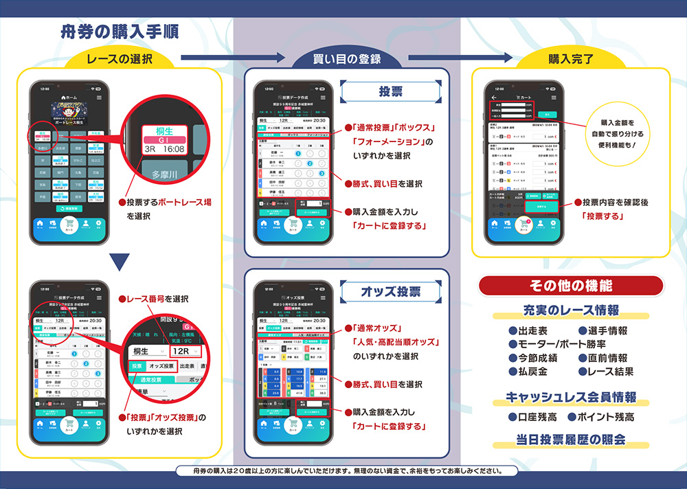 (2)専用アプリ「at boat+」をダウンロードしDKカードと連携、舟券購入