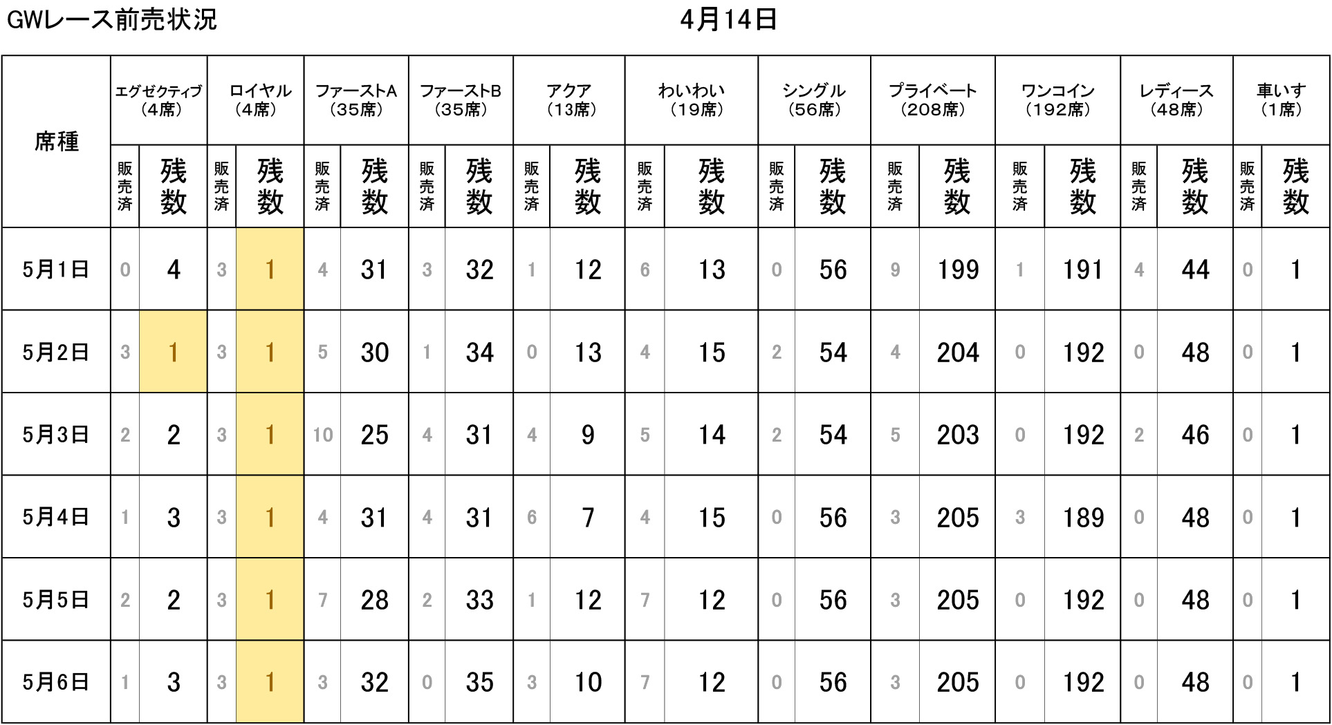 ※11レース終了時点での残数となっており、現在数とは異なる場合がございます。 ※当日の南ゲートでの指定席発売開始時間は、通常13時50分のところ5月1日~6日は13時30分となっております。