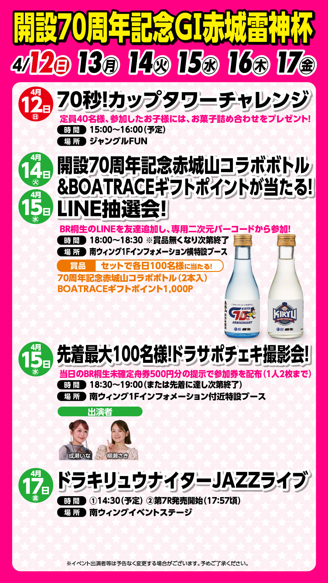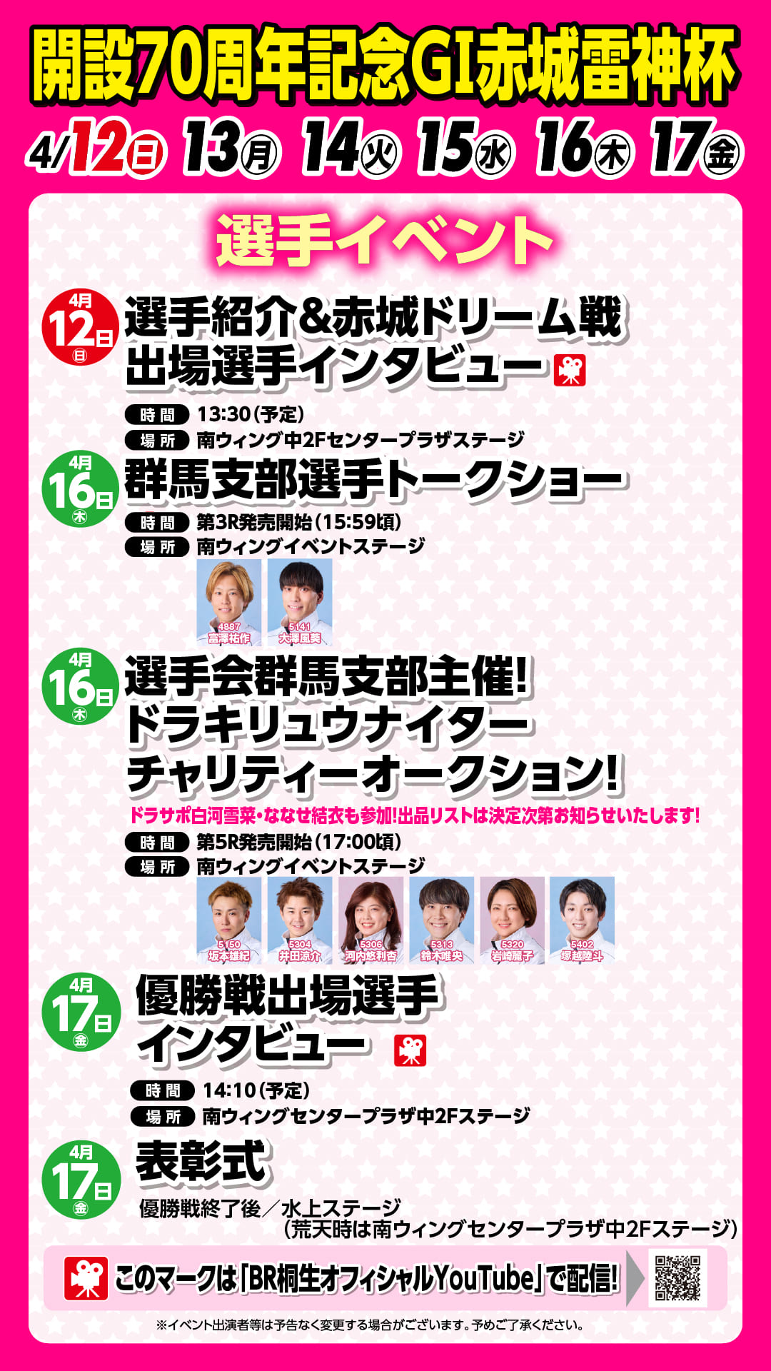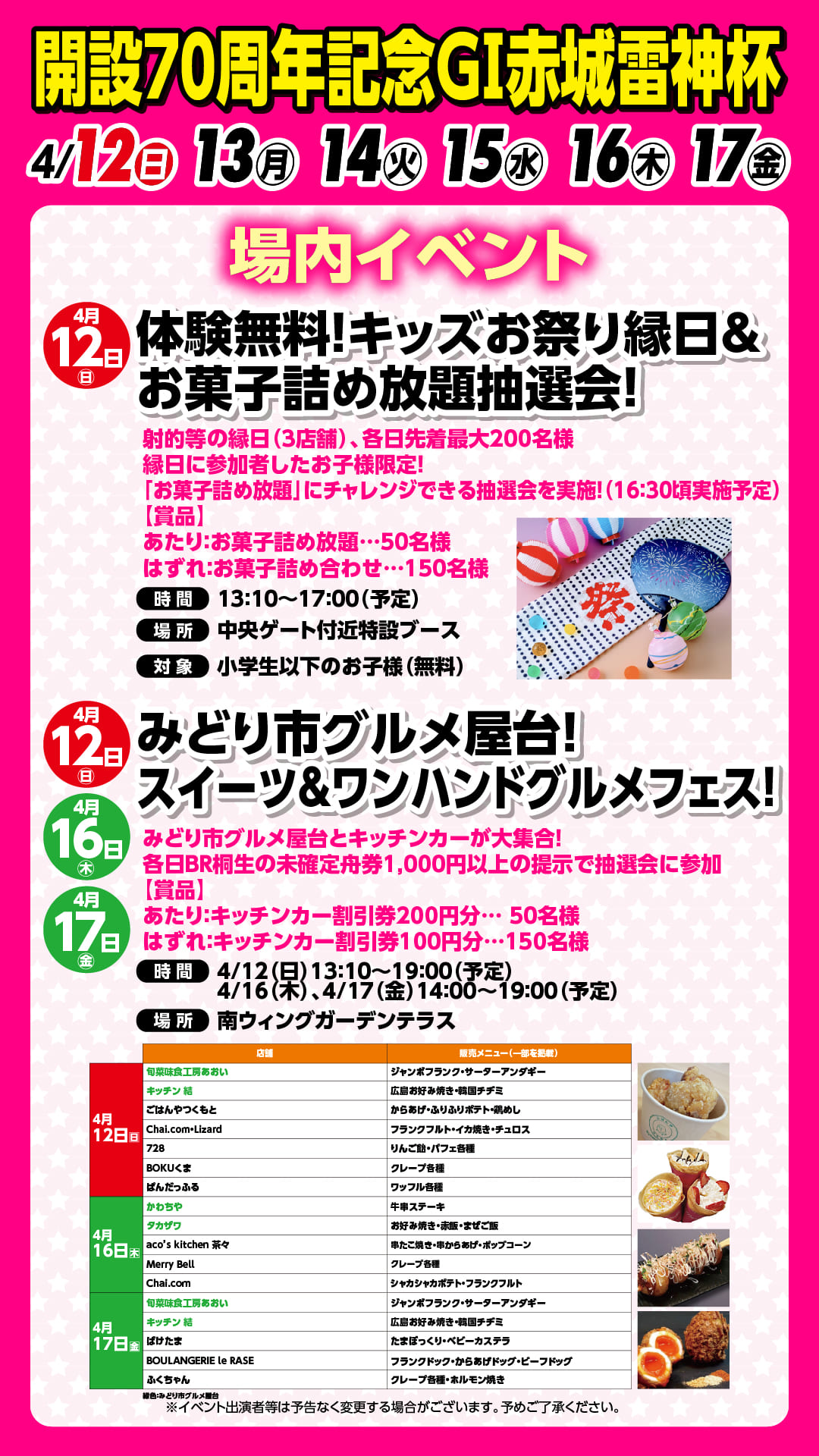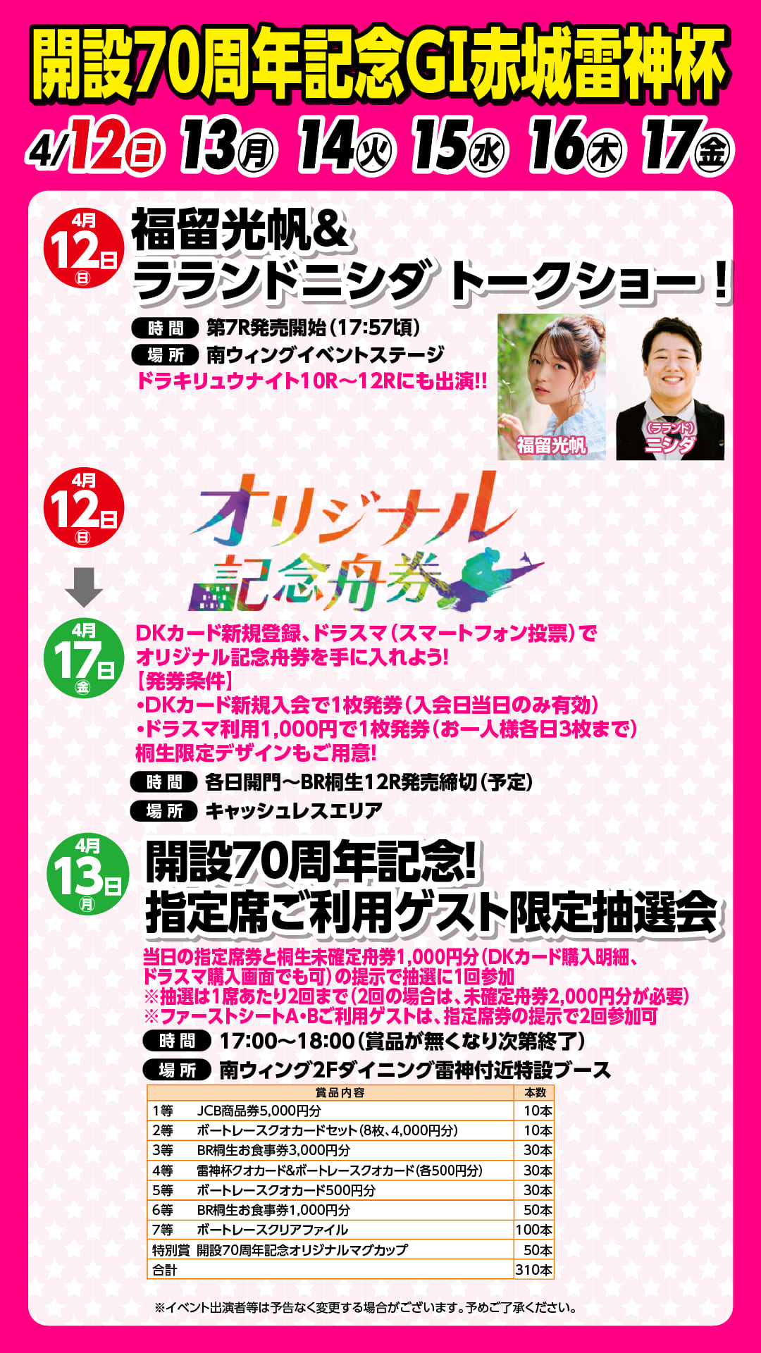 開設70周年記念 G1赤城雷神杯(4/12~17) イベント・ゲストサービスについて