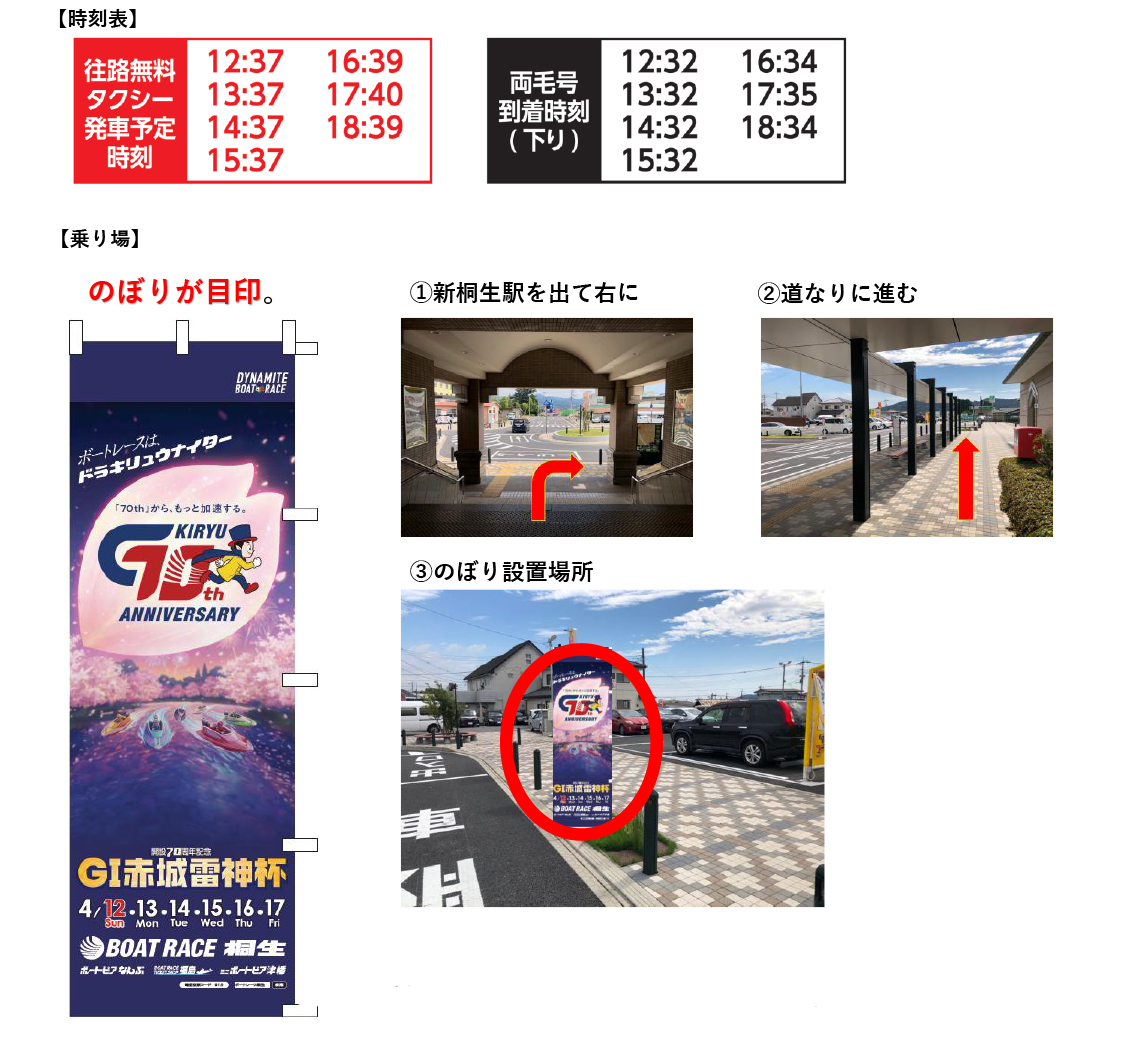 下記の期間において、新桐生駅から特急両毛号の到着にあわせ往路無料タクシーを運行いたします。