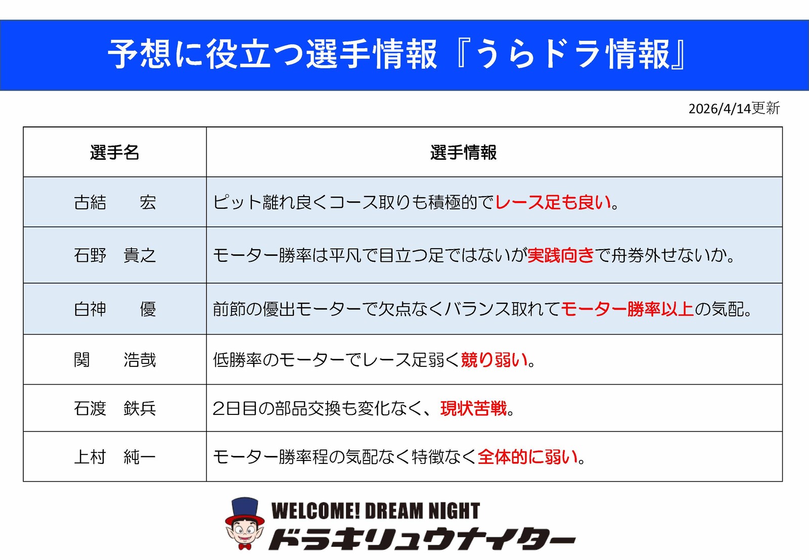 予想に役立つ選手情報『うらドラ情報』