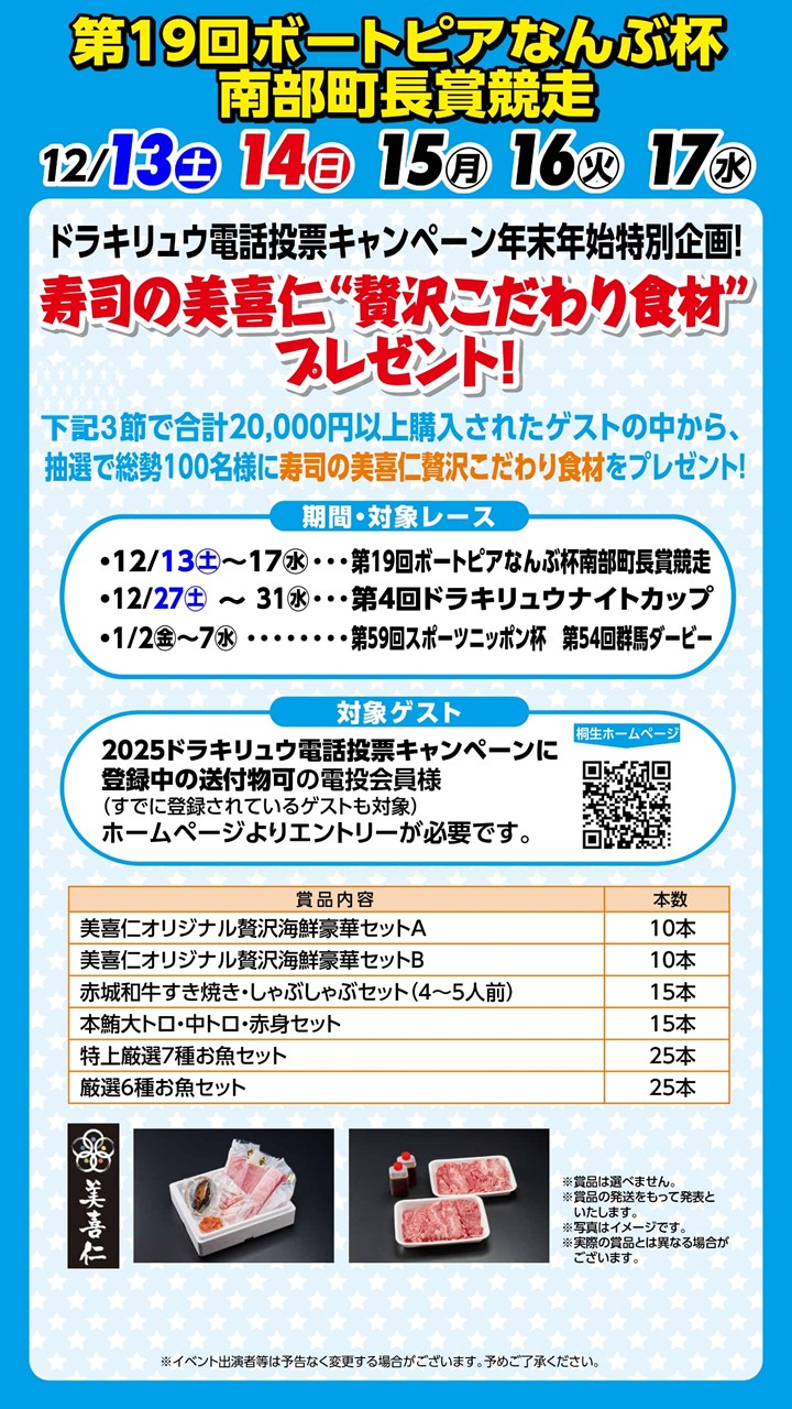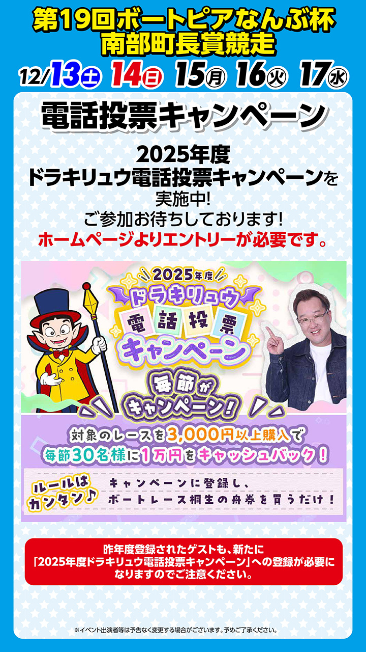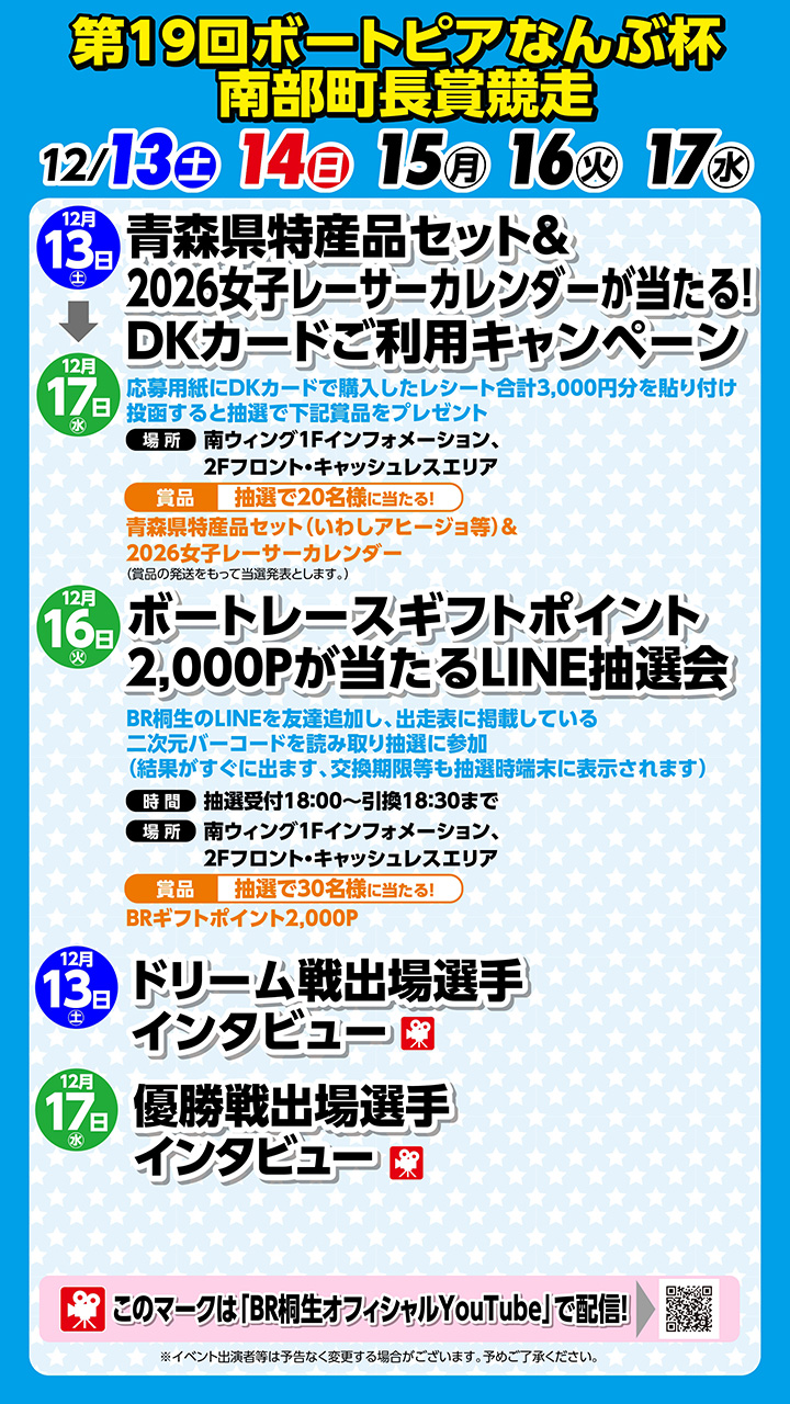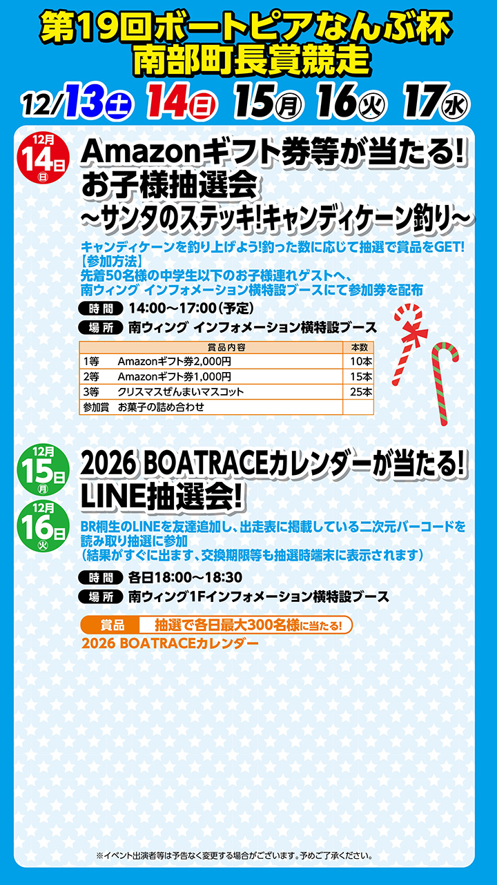 第19回ボートピアなんぶ杯 南部町長賞競走(12/13~17) イベント・ゲストサービスについて