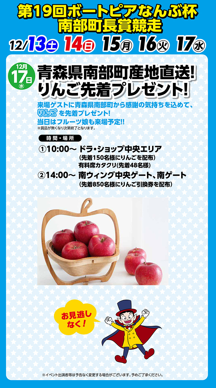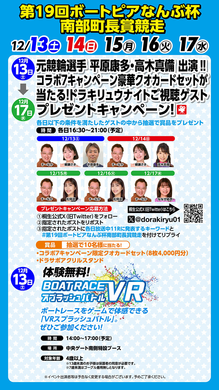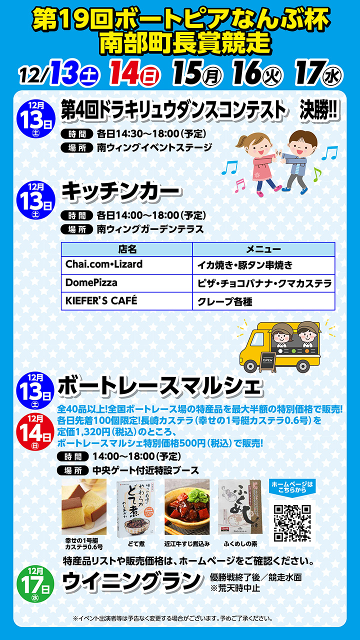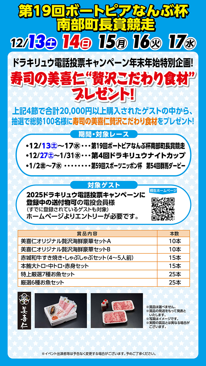 第19回ボートピアなんぶ杯 南部町長賞競走(12/13~17) イベント・ゲストサービスについて