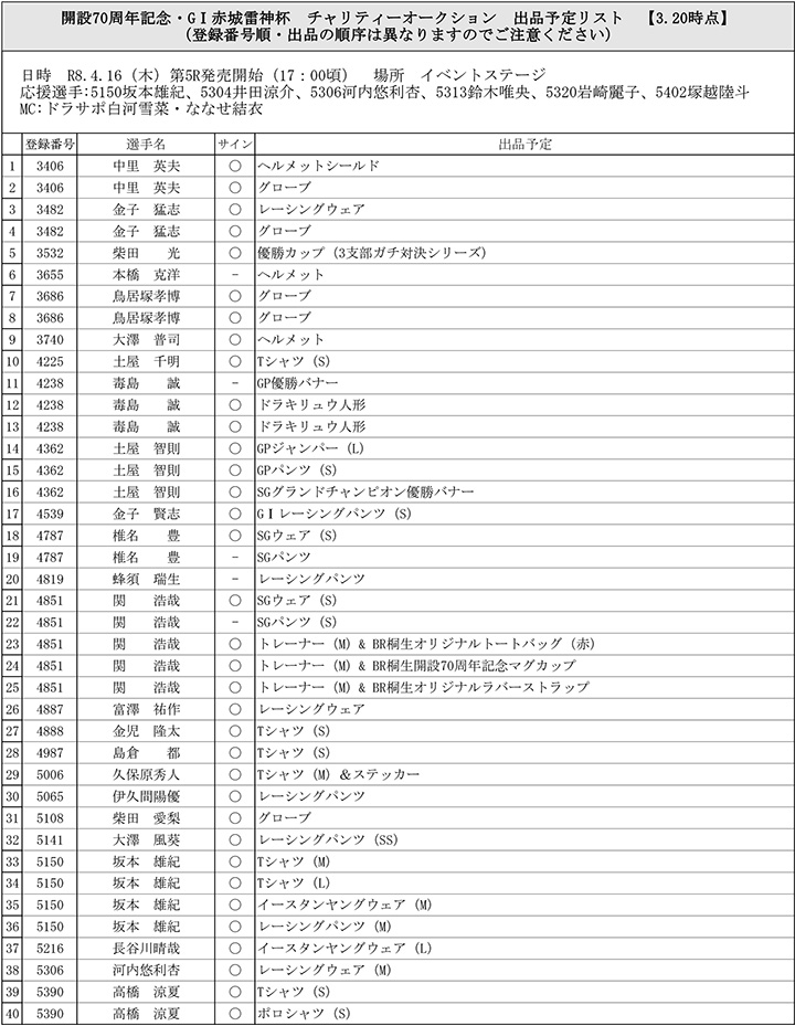 開設70周年記念 G1赤城雷神杯(4/12~17) イベント・ゲストサービスについて