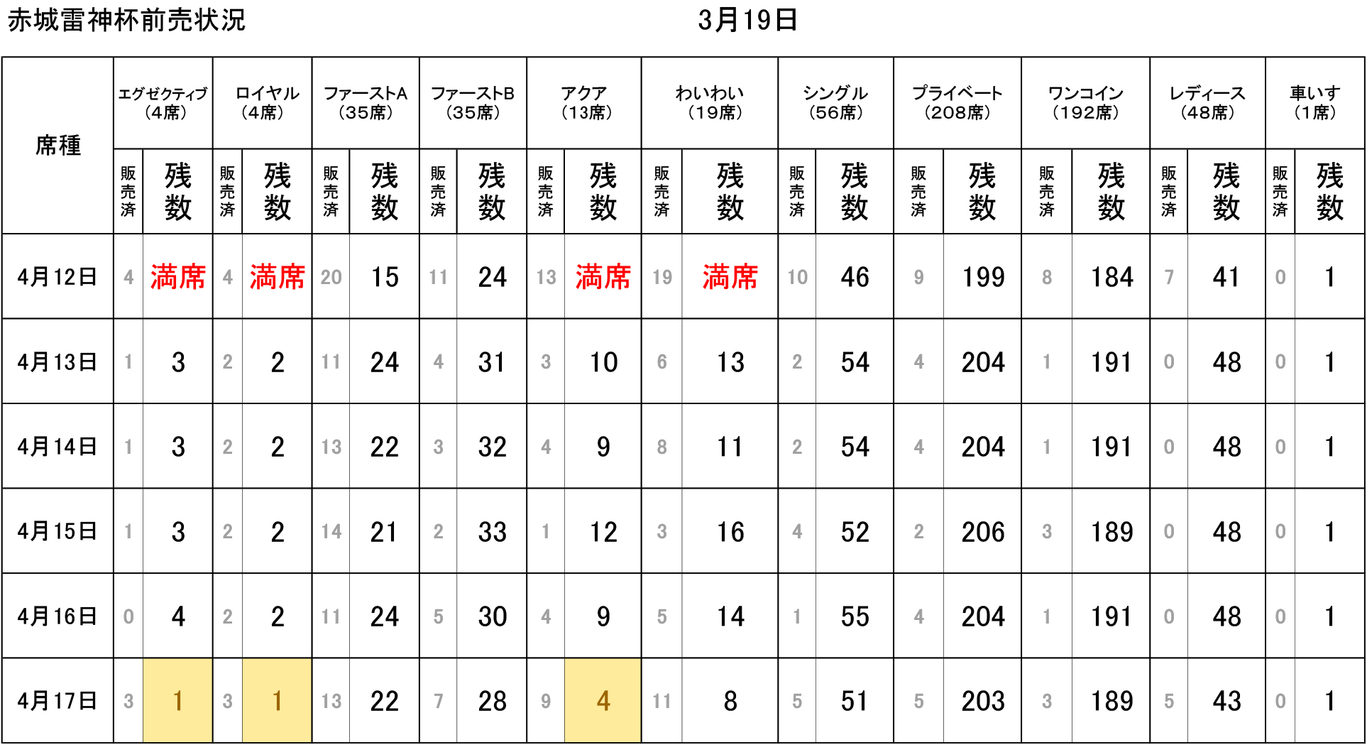 ※11レース終了時点での残数となっており、現在数とは異なる場合がございます。 ※当日の南ゲートでの指定席発売開始時間は、通常13時50分のところ4月12日は12時30分となっております。